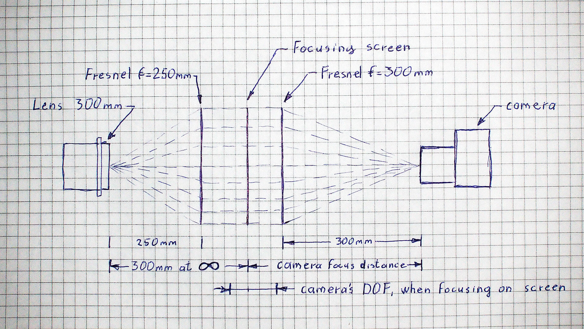 As for the lens and front fresnel - the front fresnel lens needs to have shorter focal lenght(250mm in my case) than the lens(300mm for my Industar 37). The fresnel needs to be at fixed distance from the lens, that is equal to focal lenght of fresnel lens(250mm) and they need to move together for focusing.