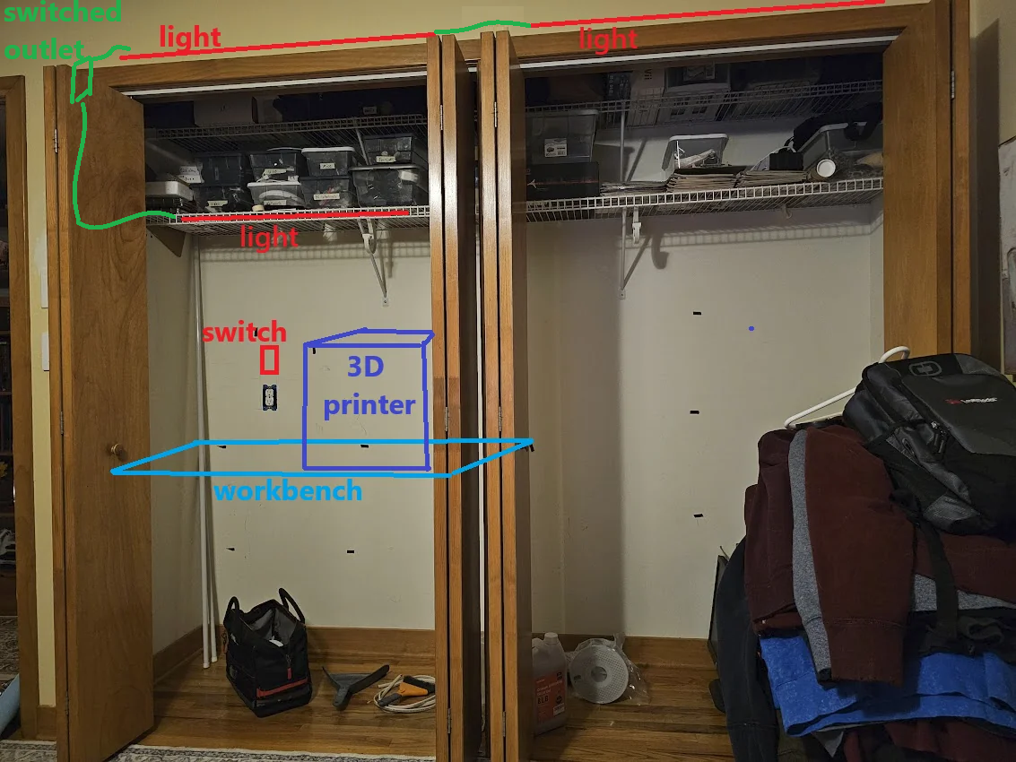 bring the wire along the wire shelf, down the wall, and drill a hole into the switch coverplate's face. (pretty poor idea, but hey, i thought of it, so it goes on the list).