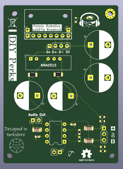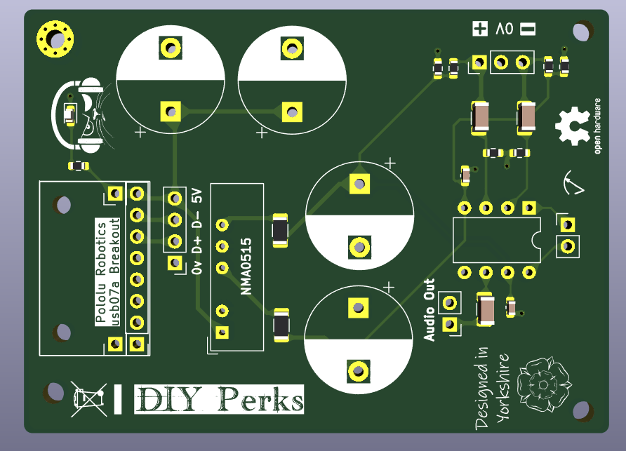 This is my quick and dirty take on @DIYPerks' original Vero design converted to part SMD and part through hole. Being SMD doesn't add a great deal to the cost and saves a huge amount of room. All four of the large capacitors are mounted on the PCB with the Polulo breakout in a roomy board with a large grounded backplane and just 70 x 50 mm give or take. The 22uF non-polar capacitors are mounted but they're pretty small in this image. This also has a bright red LED just because why not, but otherwise everything is done according to Matt's original save for the sockets which I don't have so I've use standard 2.54mm pitch jumpers on mine. "Audio out" has two pins but for convenience but only one is required if the digitiser is wired from this.